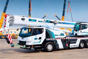 O XCT25 EV é um guindaste de três eixos com um trem de força a diesel com bateria elétrica.
