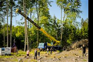 Wheeled mobile crane takes vital role lifting a piano in the making of a short film in a German forest